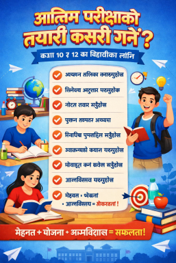 अन्तिम परीक्षामा सफलता प्राप्त गर्नको लागि नियमित अध्ययन, सही योजना, अनुशासन र सकारात्मक सोच अत्यन्त महत्वपूर्ण हुन्छ। यदि विद्यार्थीले समयको सही प्रयोग गर्दै निरन्तर अभ्यास र पुनरावृत्ति गर्छ भने उनीहरूले अवश्य उत्कृष्ट नतिजा हासिल गर्न सक्छन्।